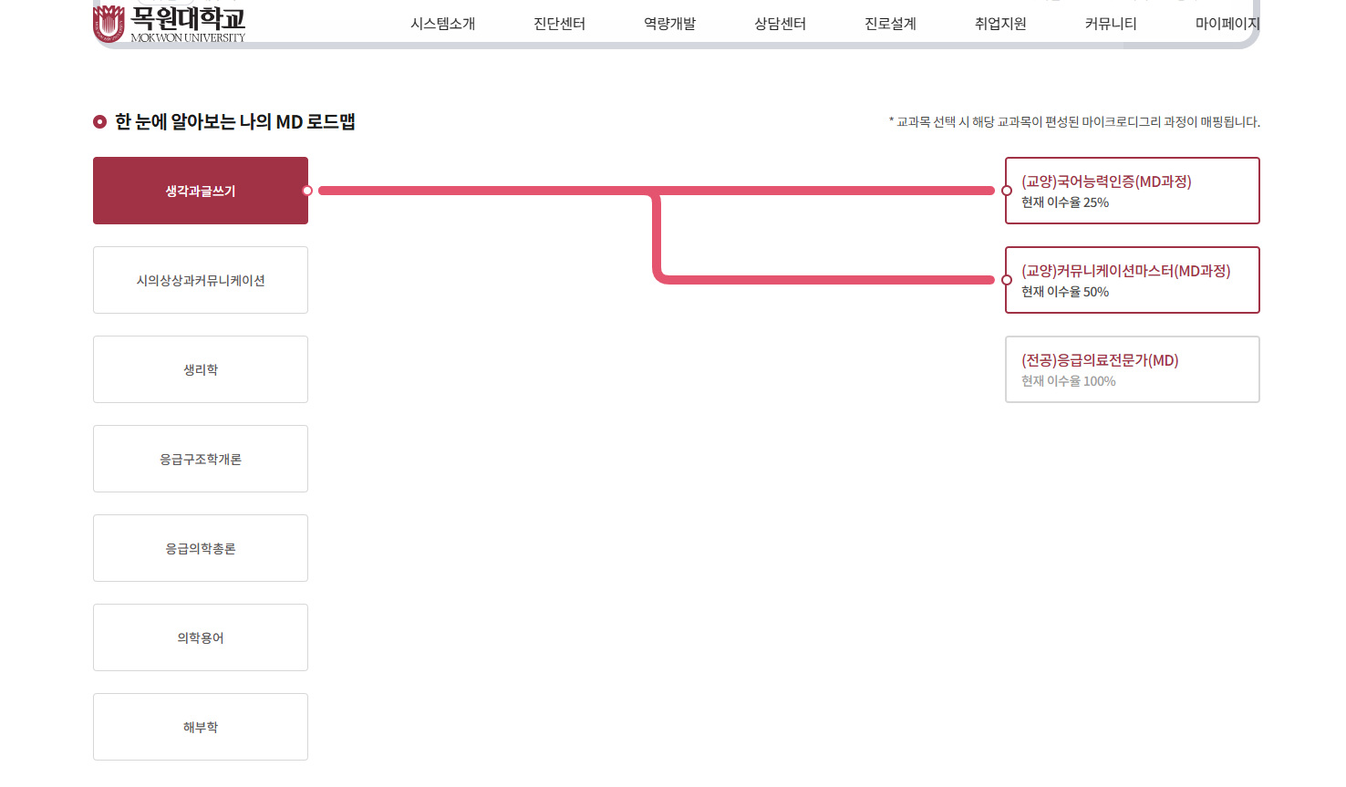 오류항목 : 맨 하단에 한 눈에 알아보는 나의 MD 로드맵에서 좌측에 표기되는 교과목은 이수완료된 교과목만아니 아닌 MD에 속해있는 모든 교과목이 노출되어야 합니다.