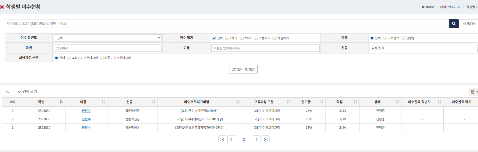 관리자 > 마이크로디그리 > 학생별 이수현황(Tình hình hoàn thành theo từng sinh viên) > 조회목록 테이블 학점 컬럼 수정
