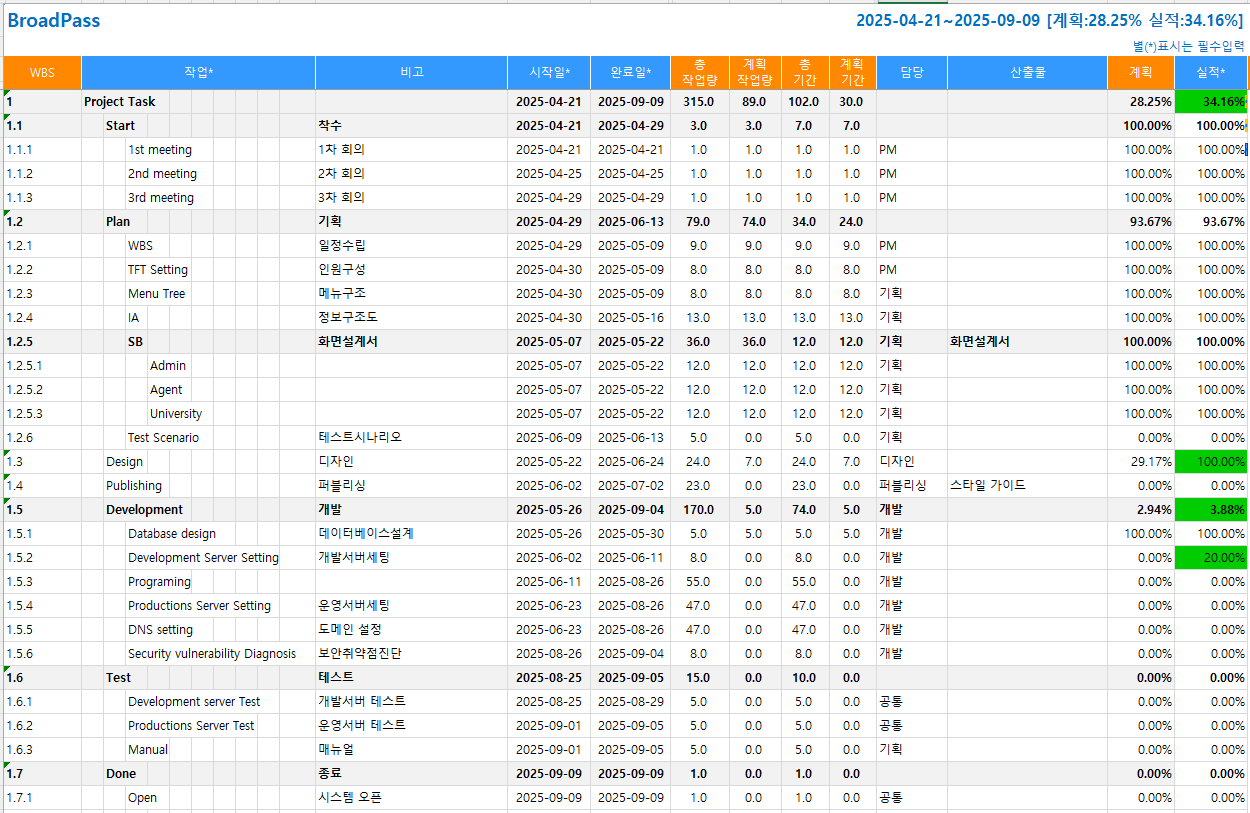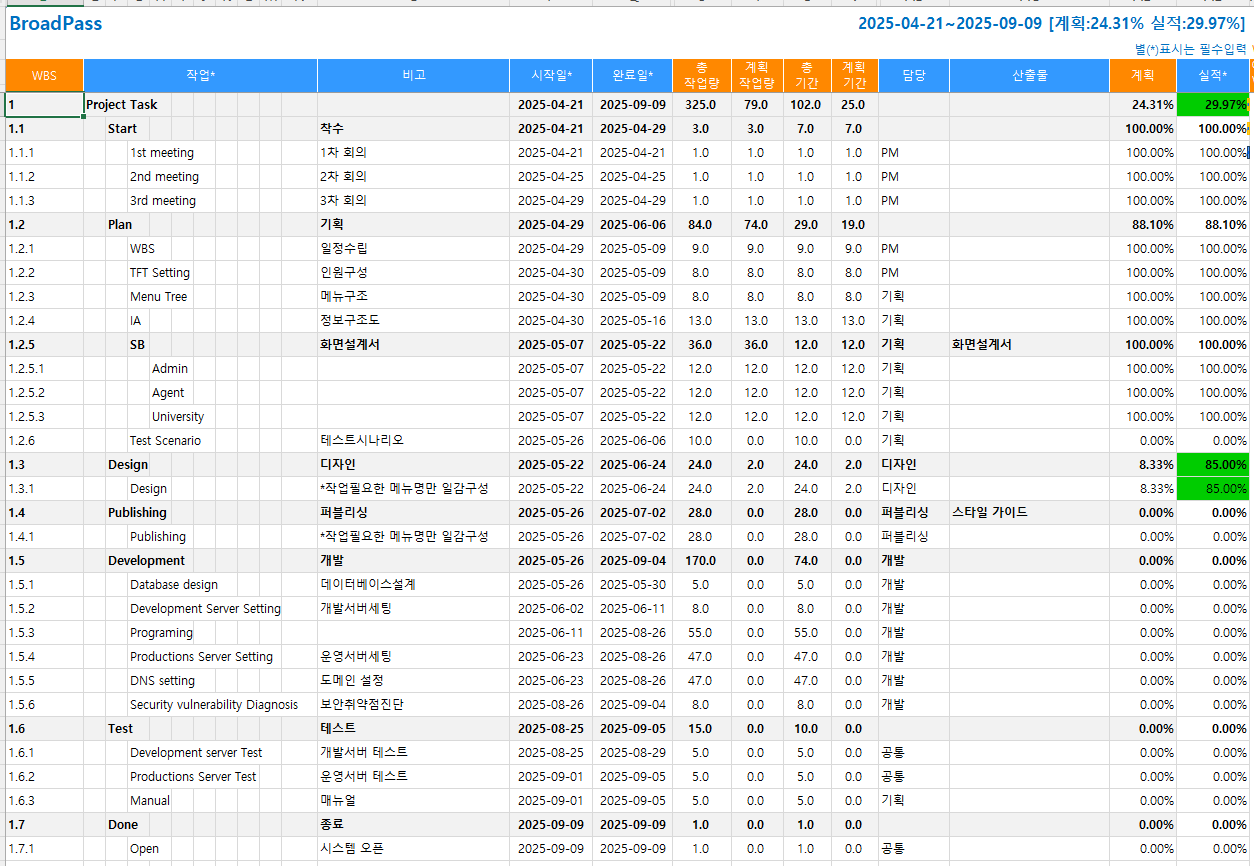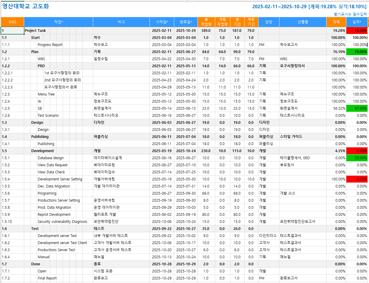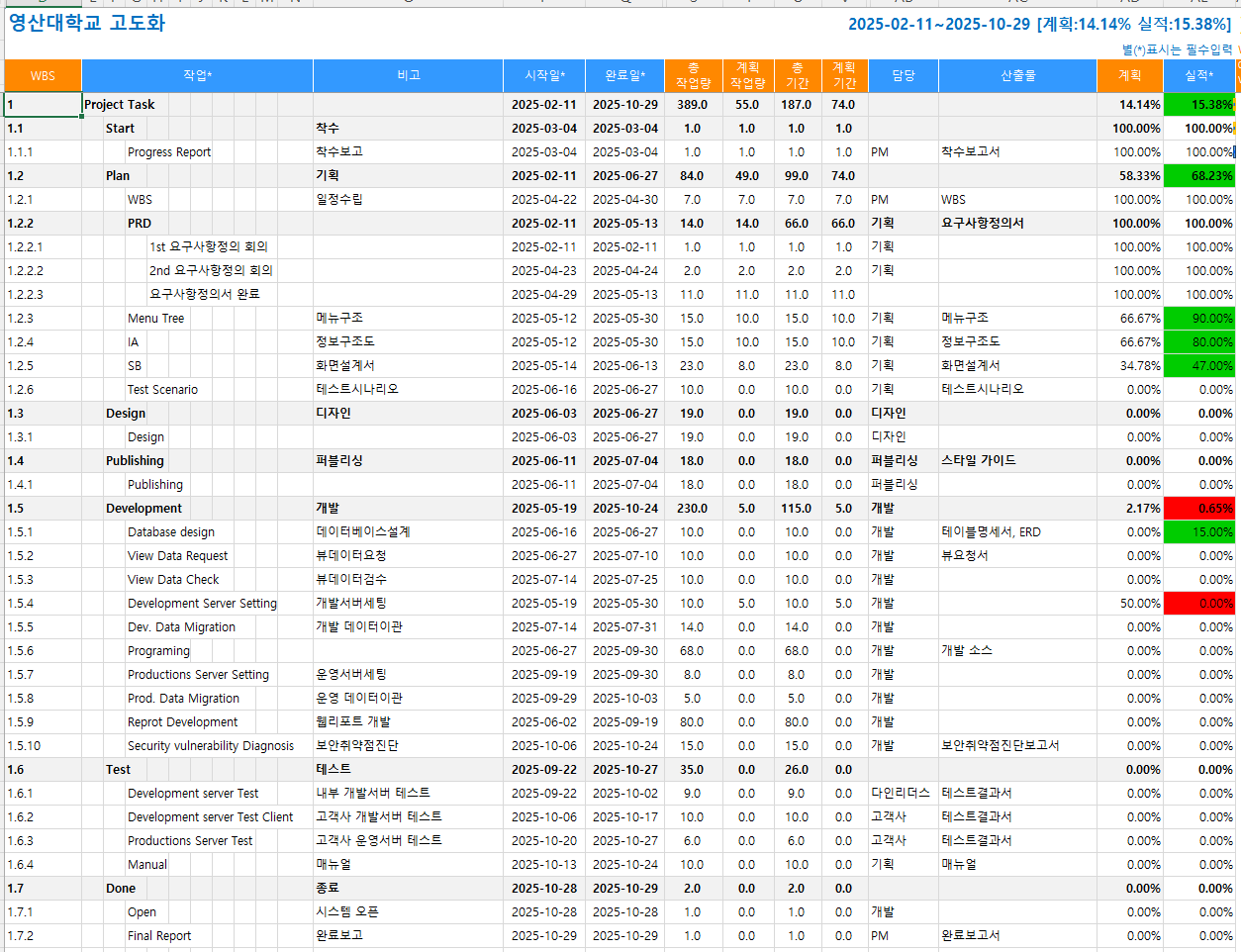 - DB 설계 : 화면설계 메뉴 단위 완료 시 DB 설계 병행 진행 30% 진행 중