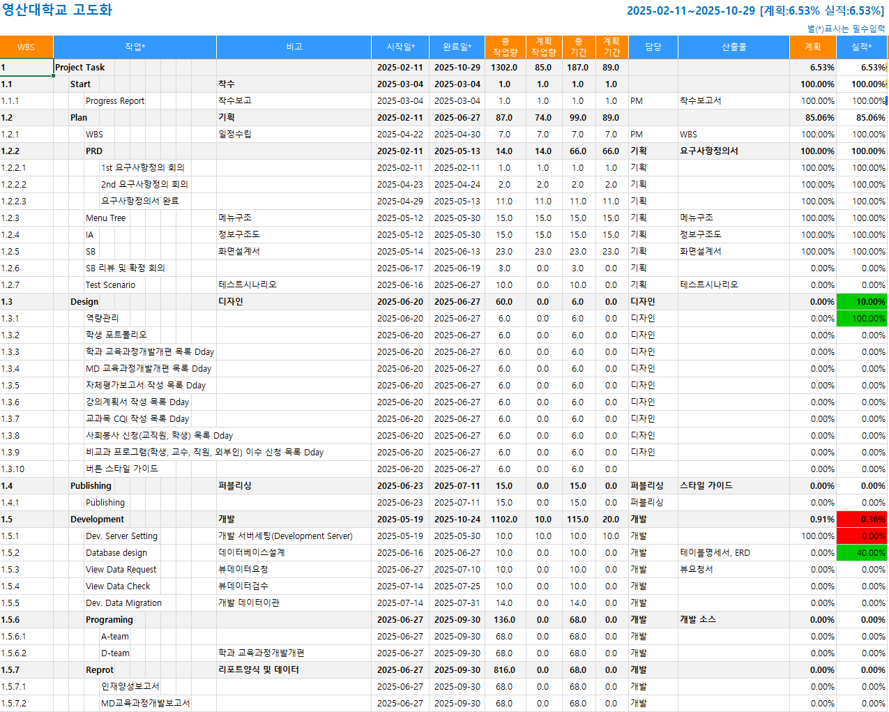 - DB 설계 : 화면설계 메뉴 단위 완료 시 DB 설계 병행 진행 30% 진행 중